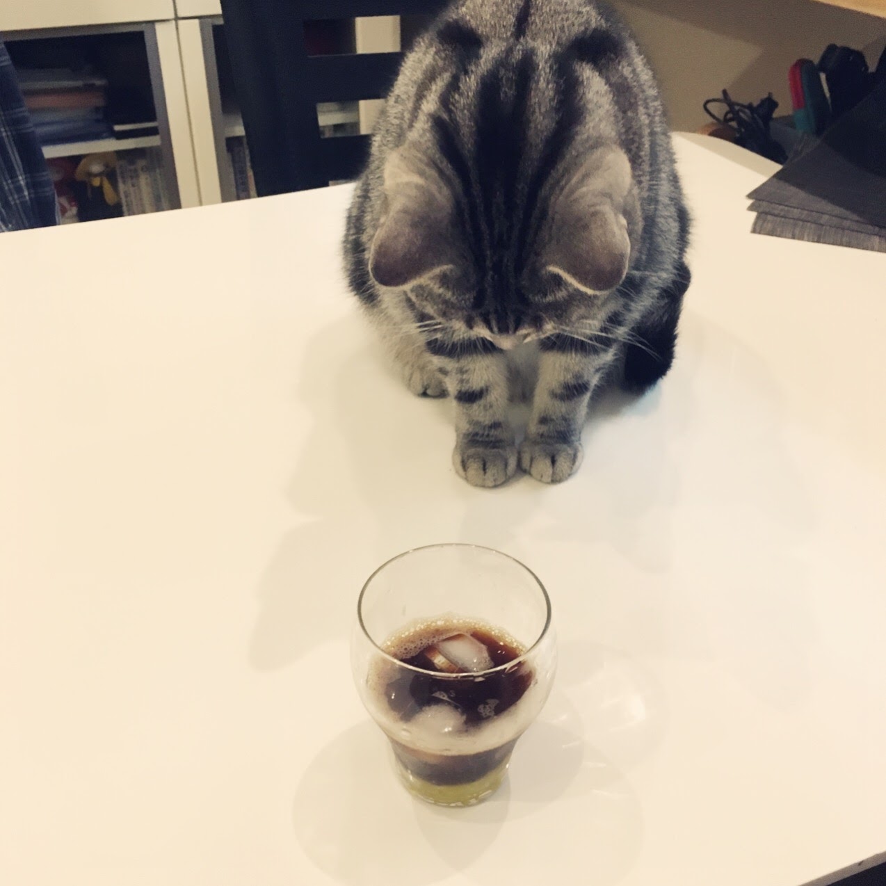 人の氷を盗もうとしている実家猫。隙を狙っています。