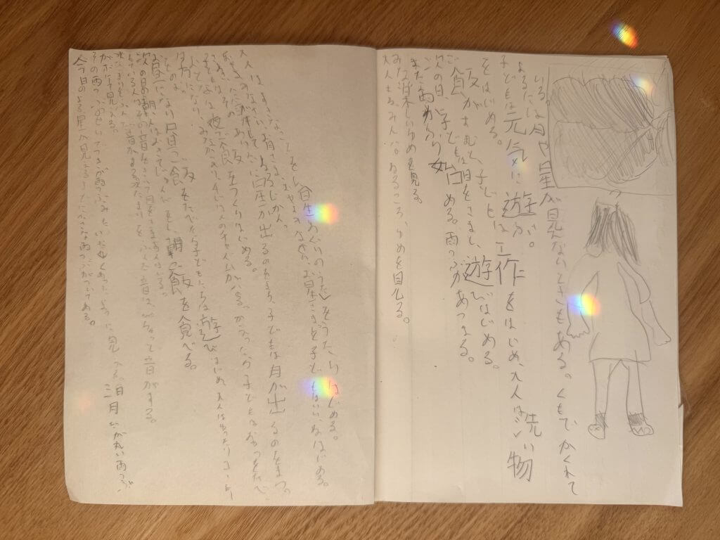 自由帳を折って、ホチキスでとめて、本の形にして。